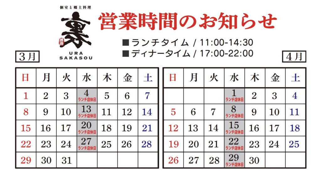 3月4月ランチ営業日のお知らせ