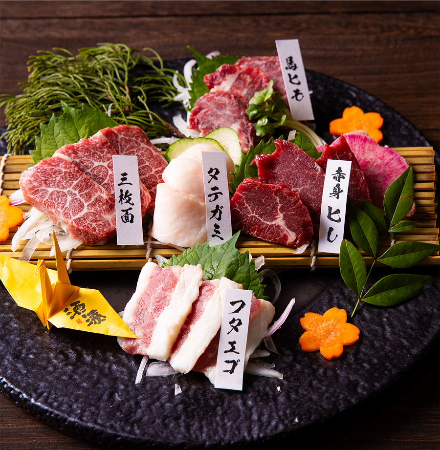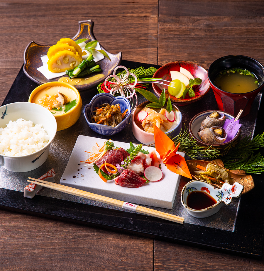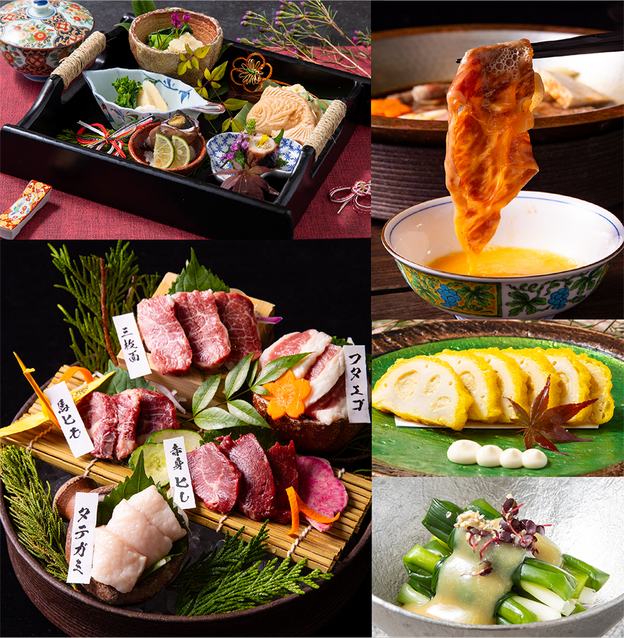 熊本ならではの味覚と文化を、心ゆくまでお楽しみいただける特別なひとときをご提供します。全席個室の落ち着いた空間で、希少部位を含む馬刺しや馬しゃぶ、熊本黒毛和牛すき焼き、名物・辛子れんこんなど、郷土料理を豊富にご用意。熊本城の城下町をイメージした趣ある雰囲気の中で、旅の思い出に残るひとときをお過ごしください。